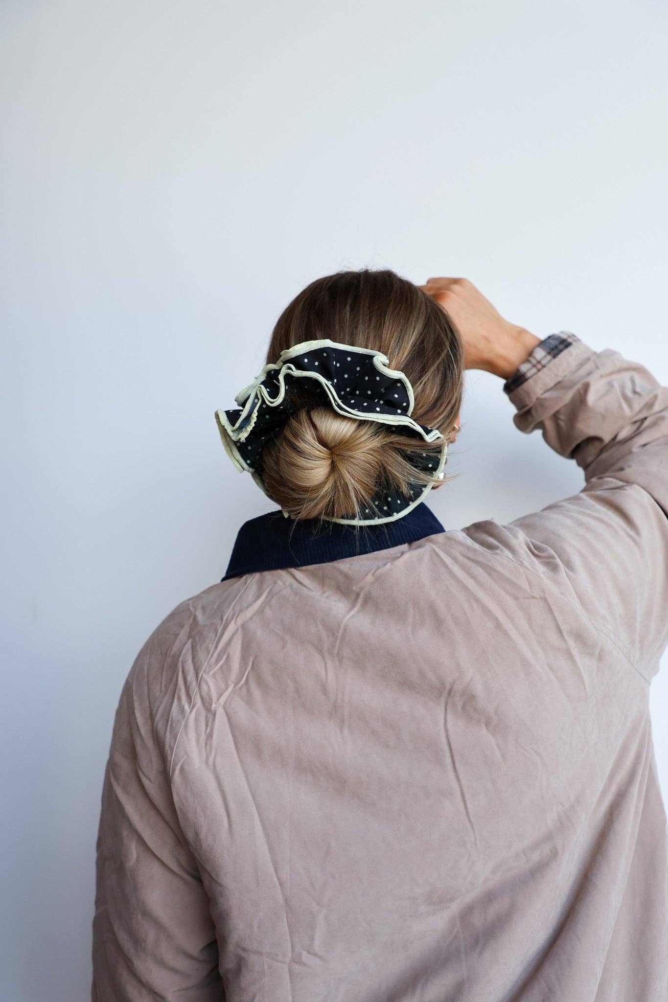 The bigger the better. Take your everyday scrunchies and make them 5x the size for the most feminine statement piece. The scrunchie is made of a lightweight chiffon fabric to allow for a natural fall for this two-layered corset scrunchie.