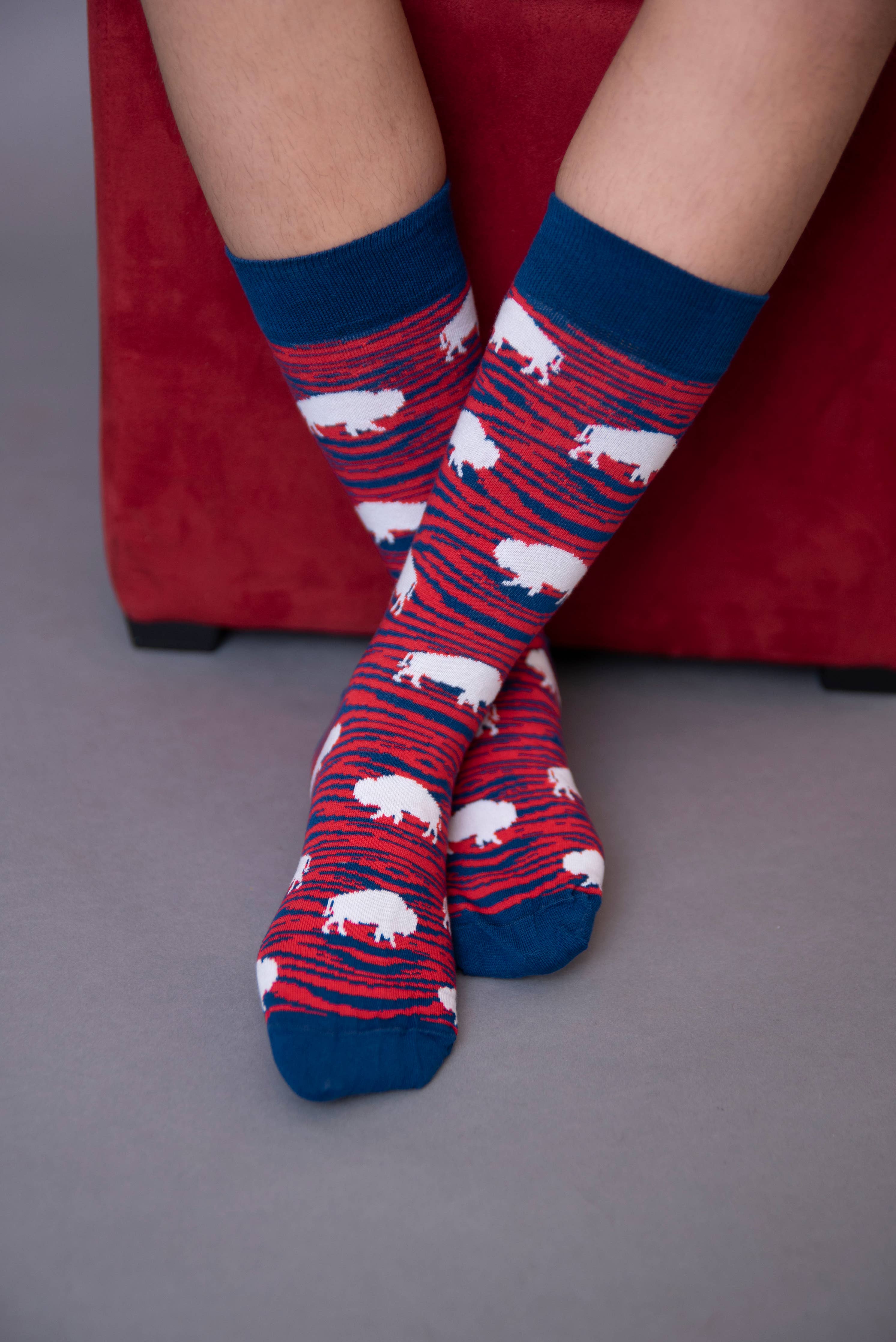 Your going to score a touchdown when you wear these awesome red and blue zebra buffalo socks! They not only keep you warm in style, but also proclaim that you are the biggest buffalo fan. Just don't go crazy jumping on tables or anything. Show your buffalo pride at the office, while you watch the game on the weekend, and just for casual, everyday team spirit!