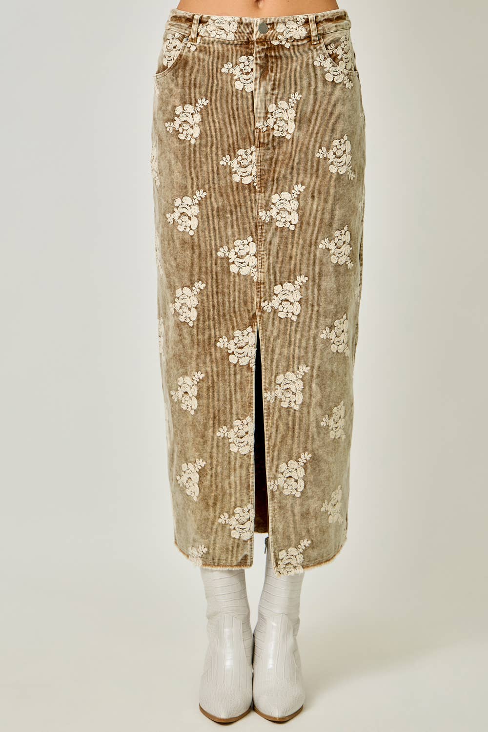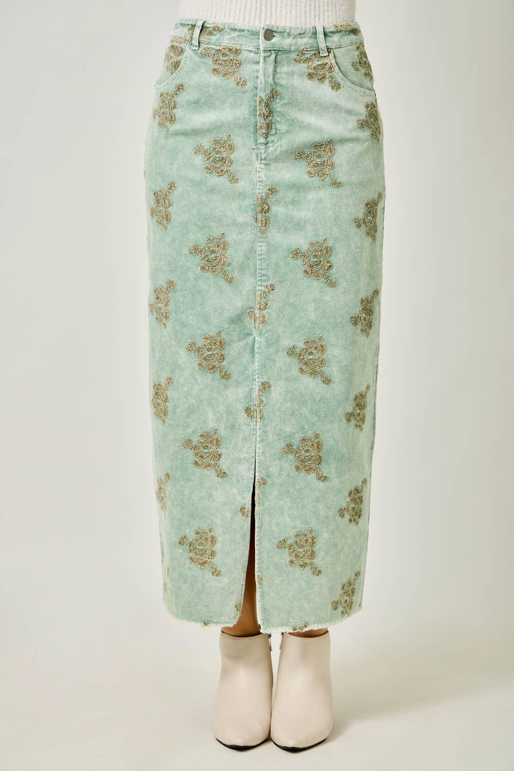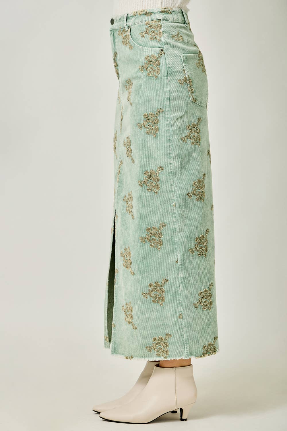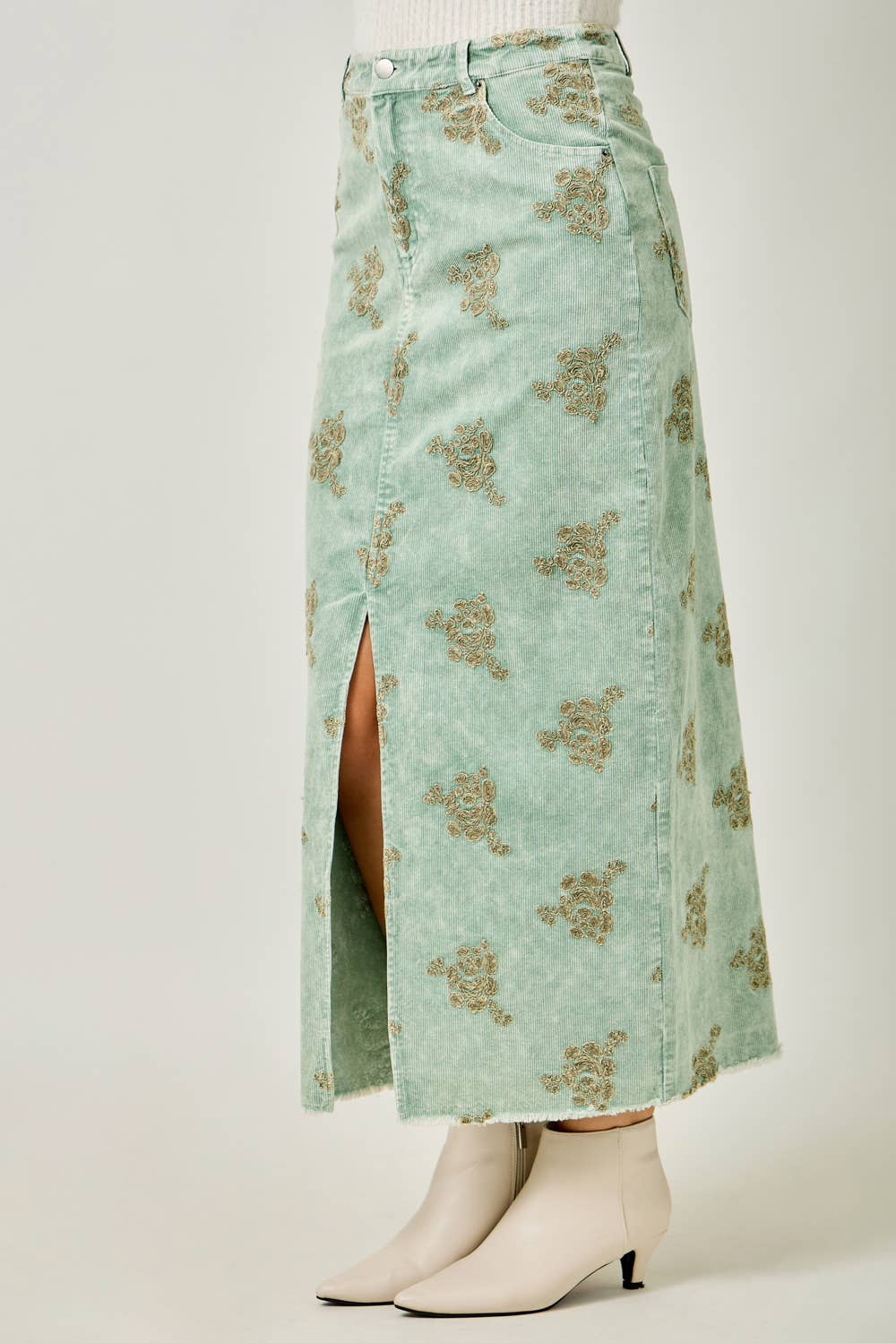 - Embroidered Front Slit Corduroy Skirt