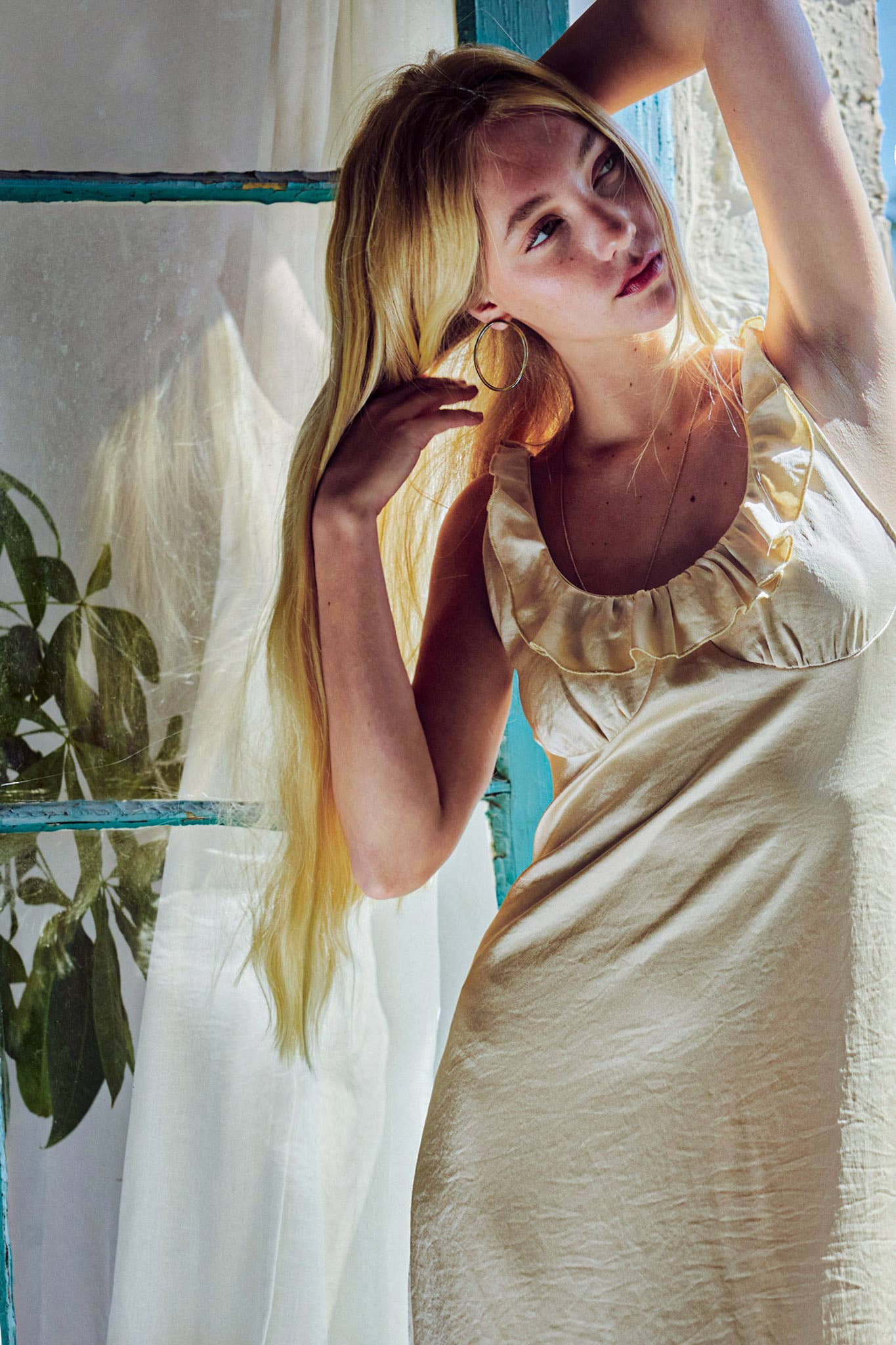 Frilled Sleeveless Midi Slip Dress in Champagne