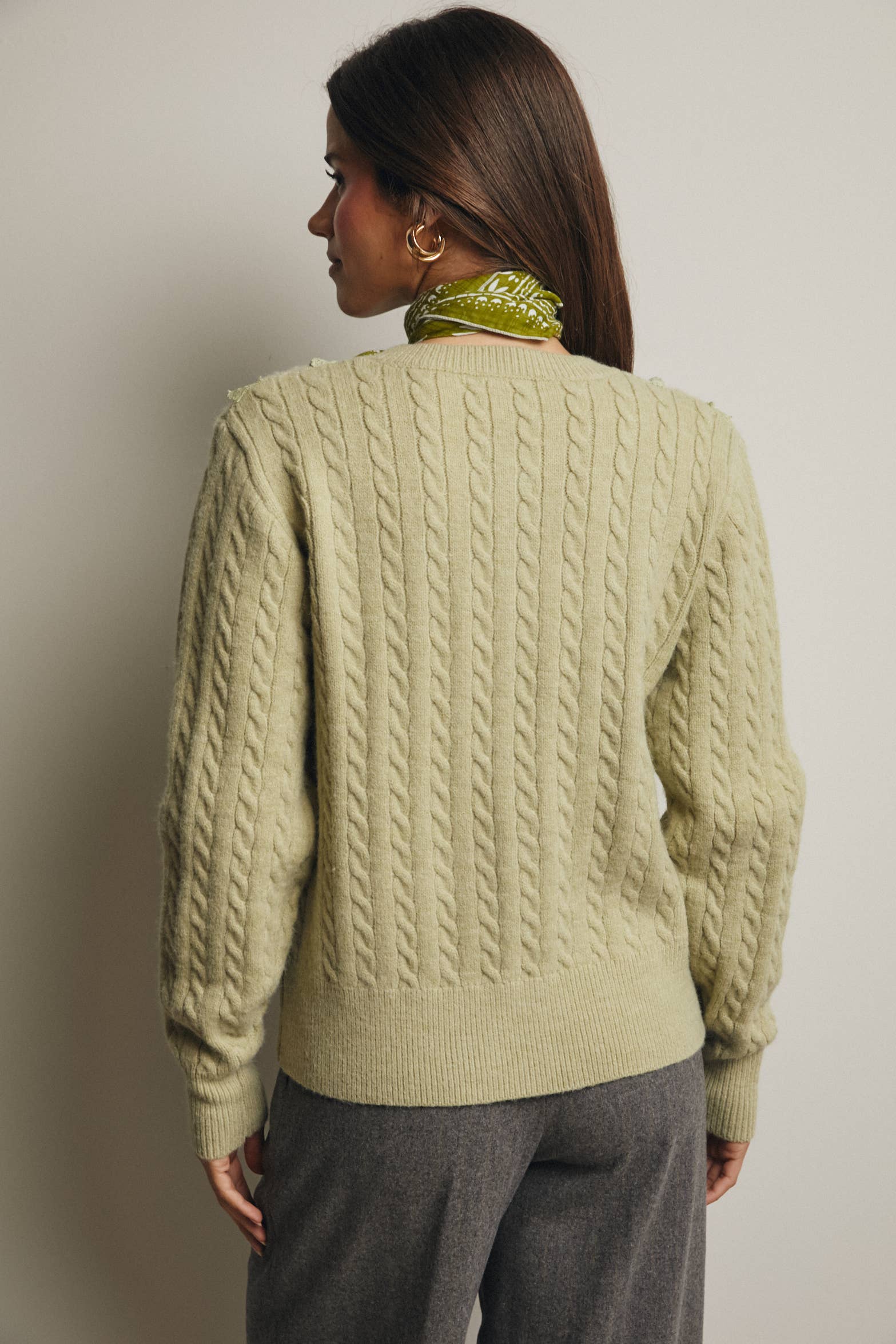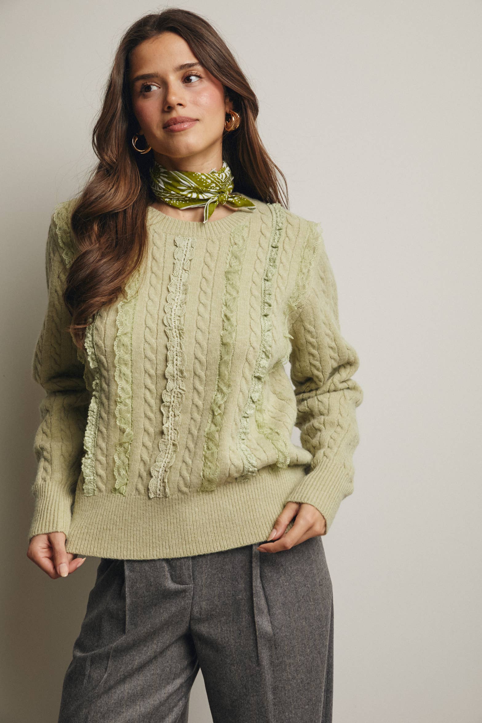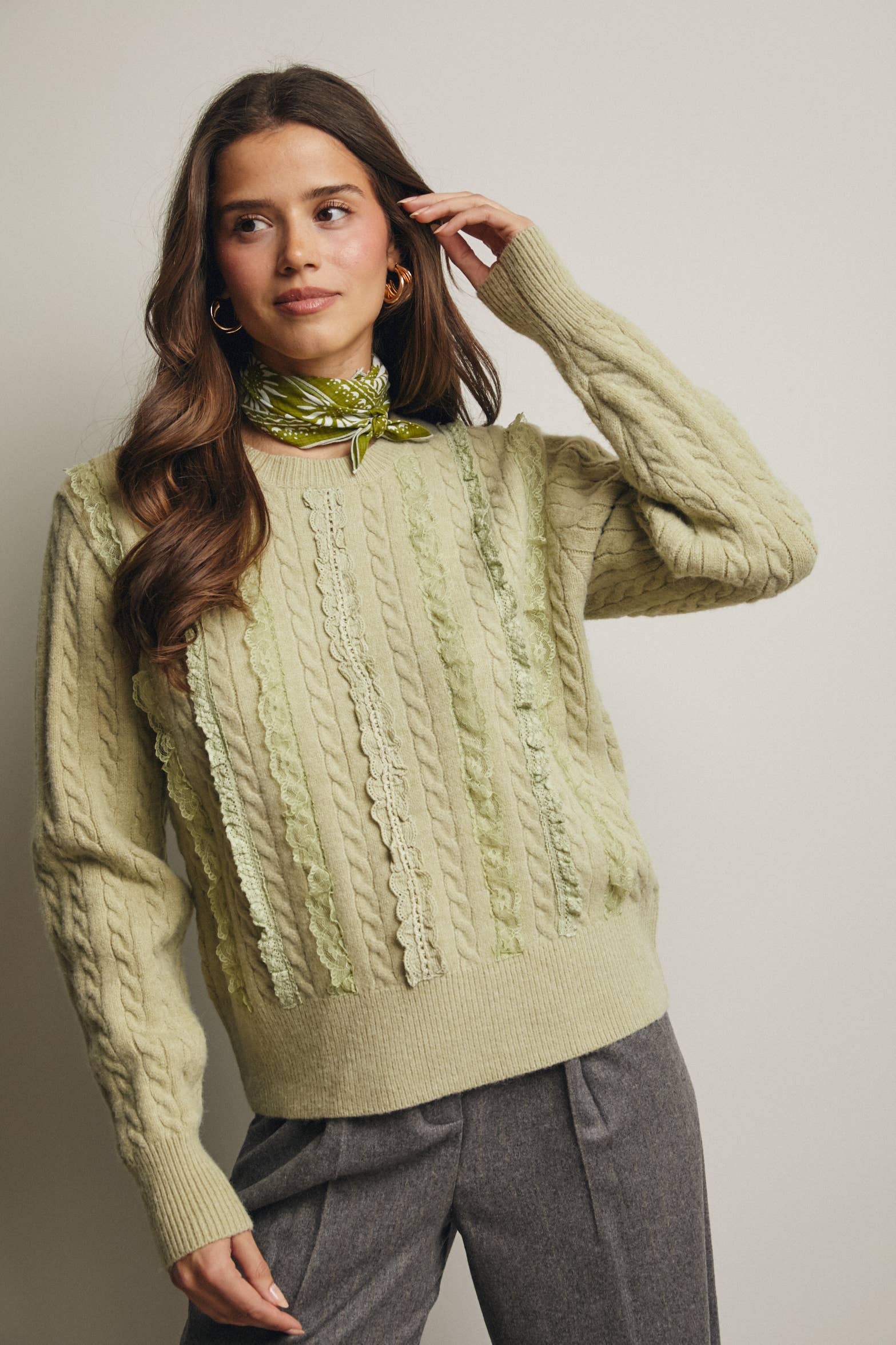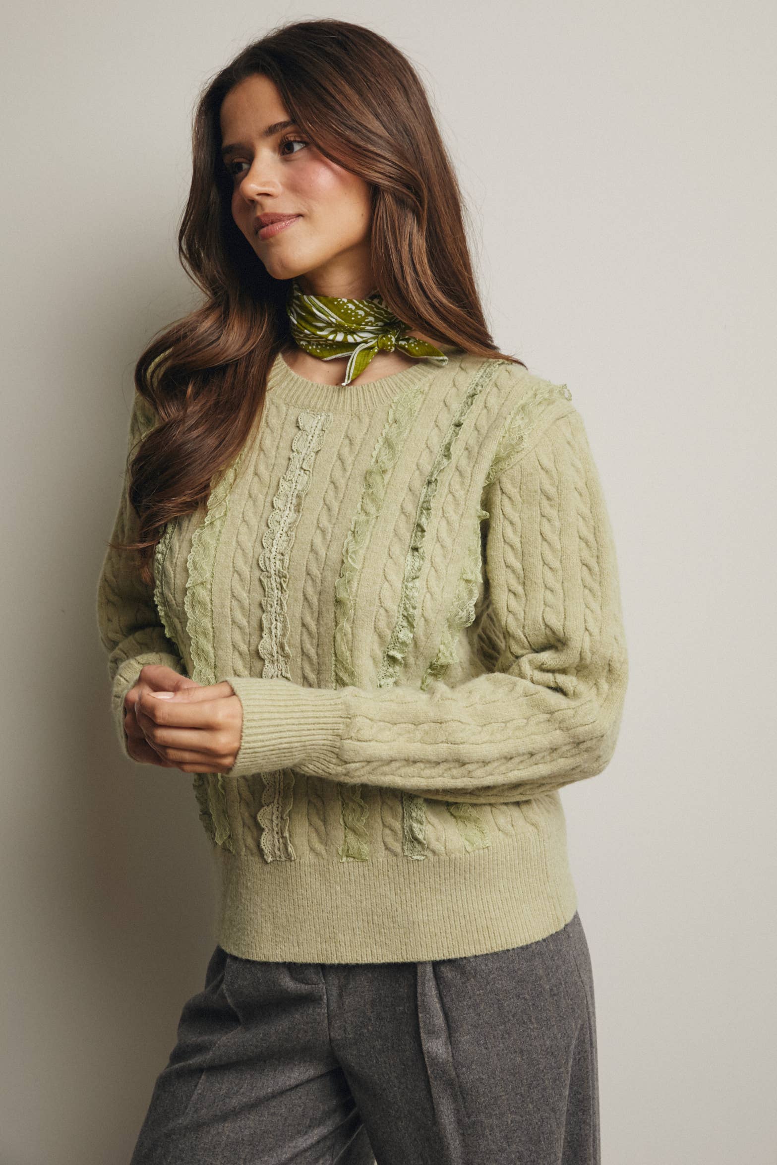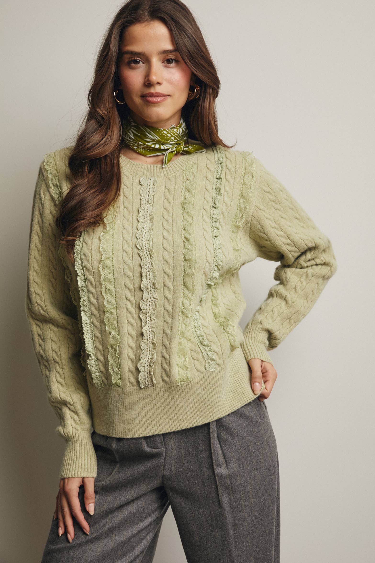 • Feminine Lace Accents: Vertical lace ruffles sewn between cable stitches add vintage-inspired elegance