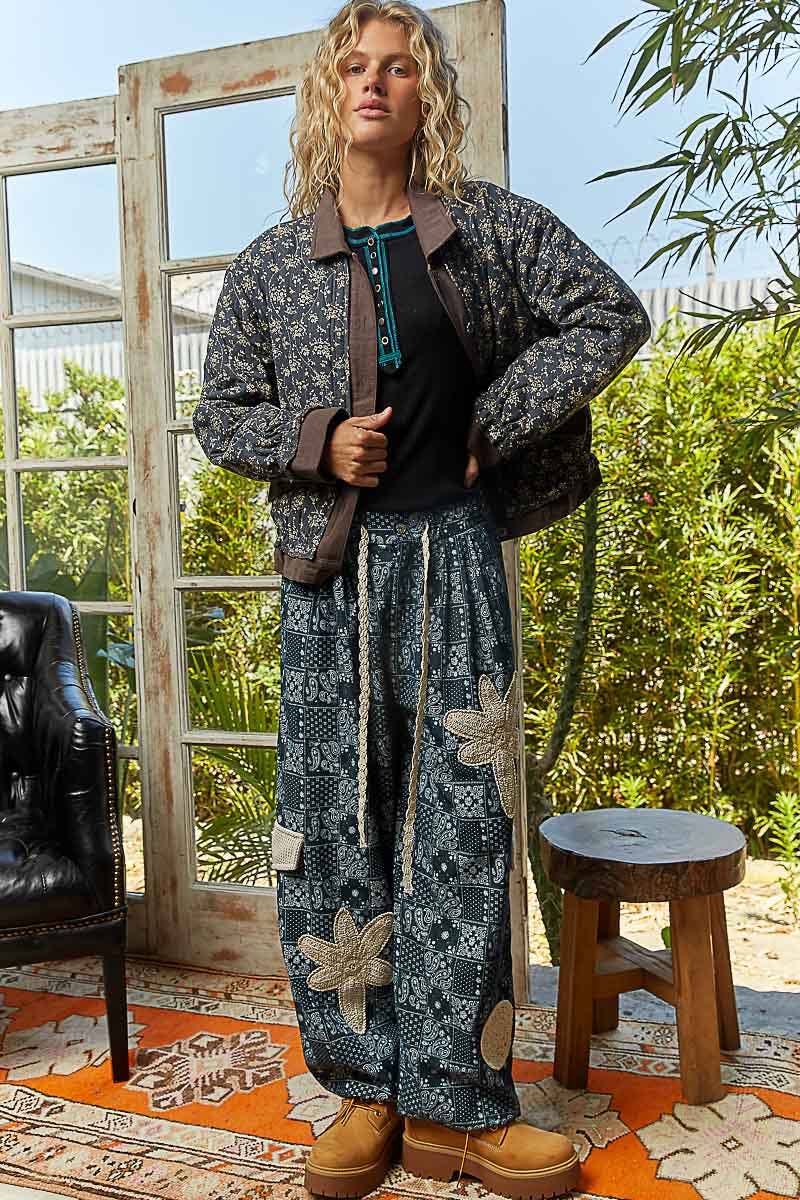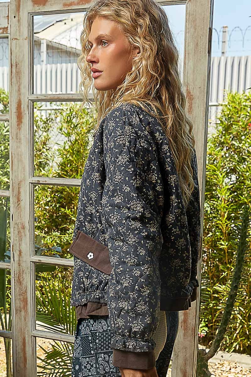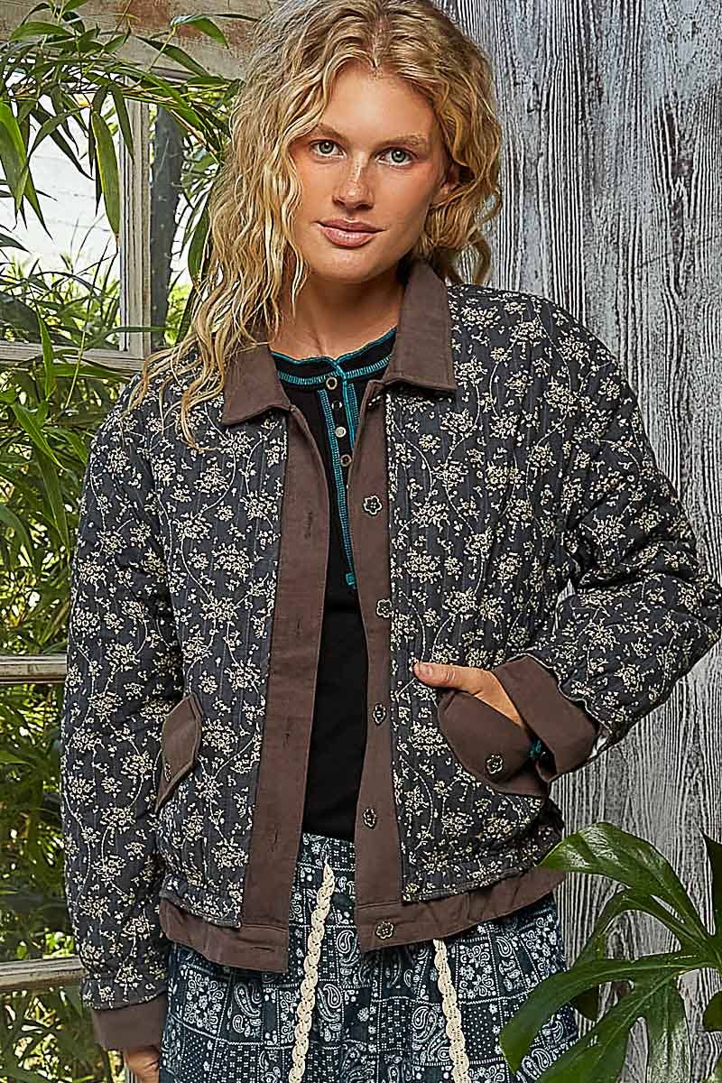 Designed in long sleeve regular fit jacket top in quilting with twill placket, collar, metal button down, normal washing, floral pattern.