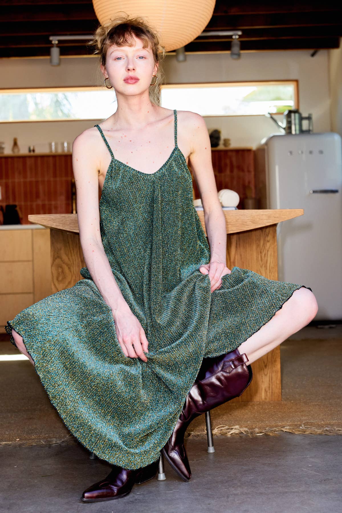 The overall effect of the Metallic Aurora Camisole Pleated Midi Dress is a balance of elegance, modernity, and shine, making it a standout piece for special occasions. Pleats detail, Adjustable straps, Midi length.