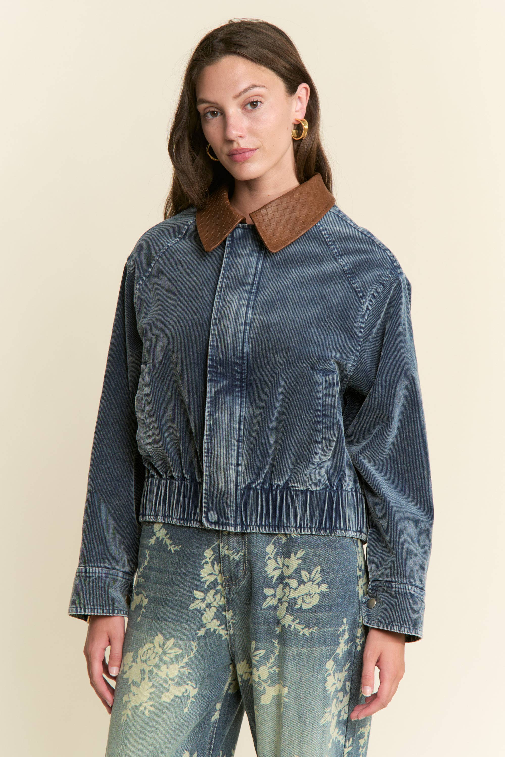 Women's mineral washed corduroy button down jacket. Designed with a fuax leather collar.