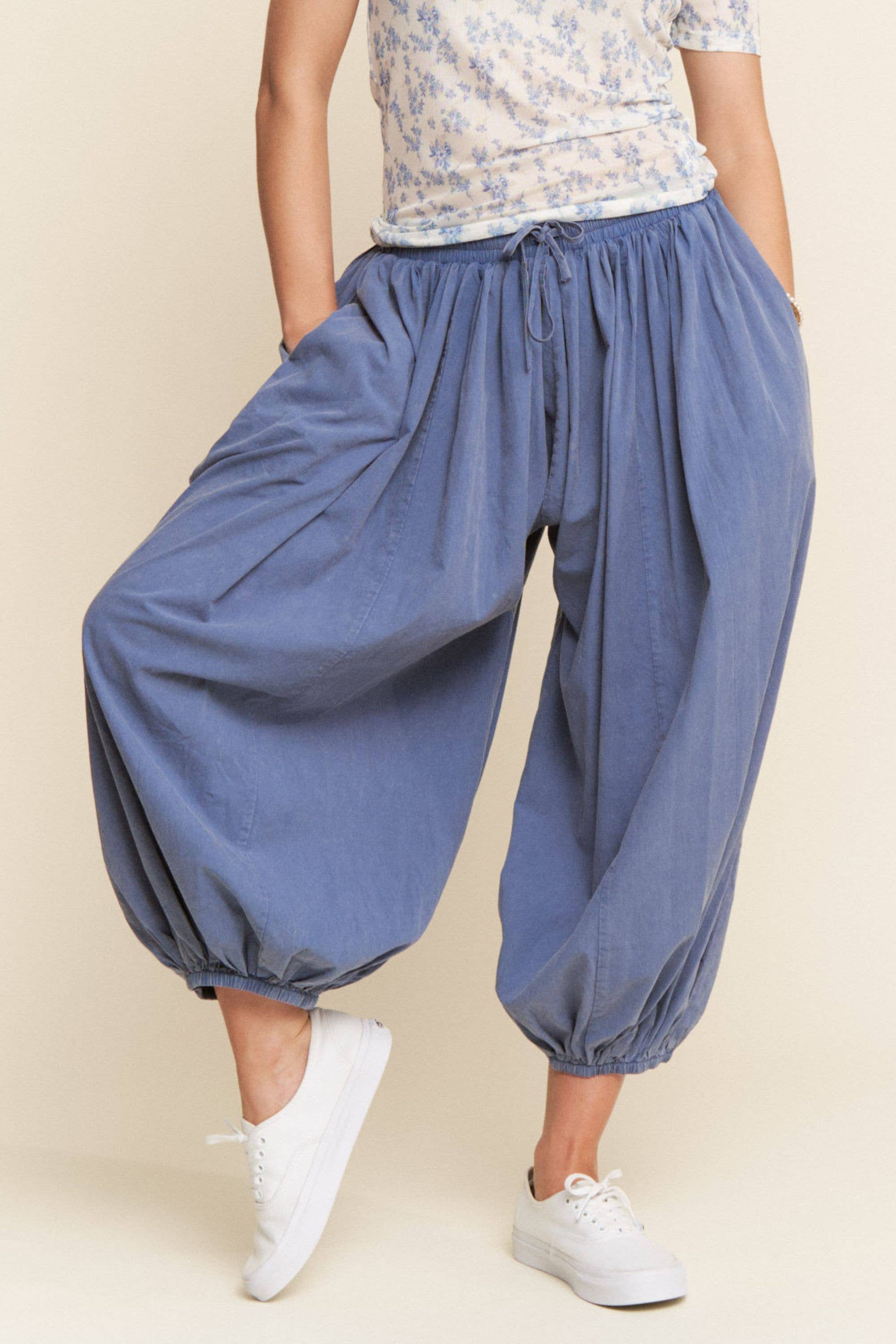 Women's casual boho mineral washed drawstring elastic waist band balloon joggers with pockets.
