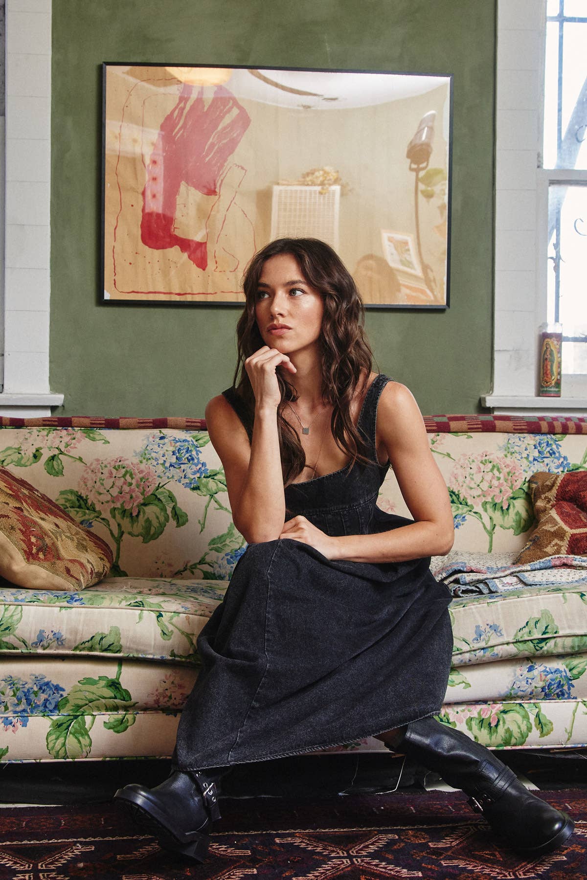 Square Neck Denim Midi Dress in Black
