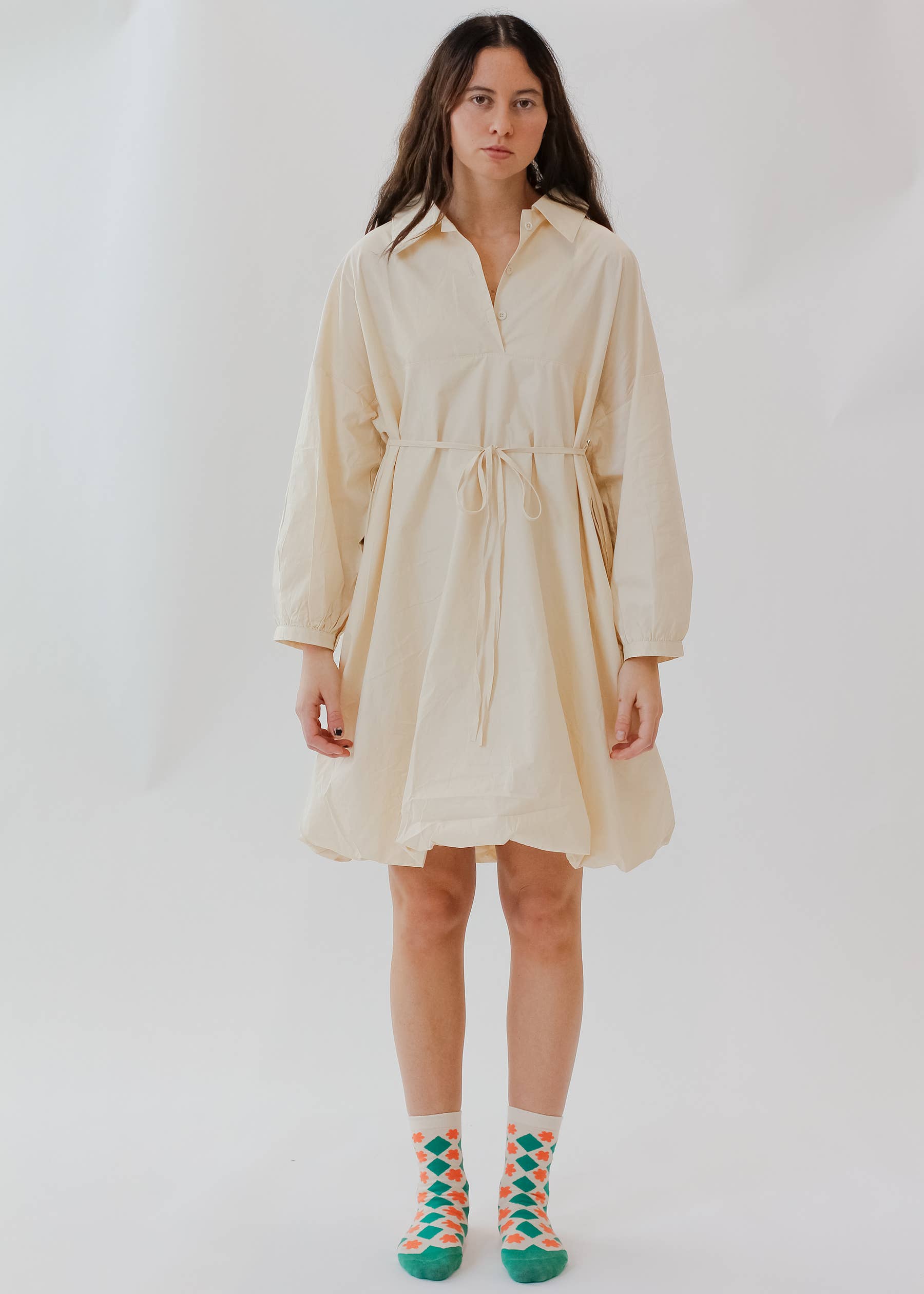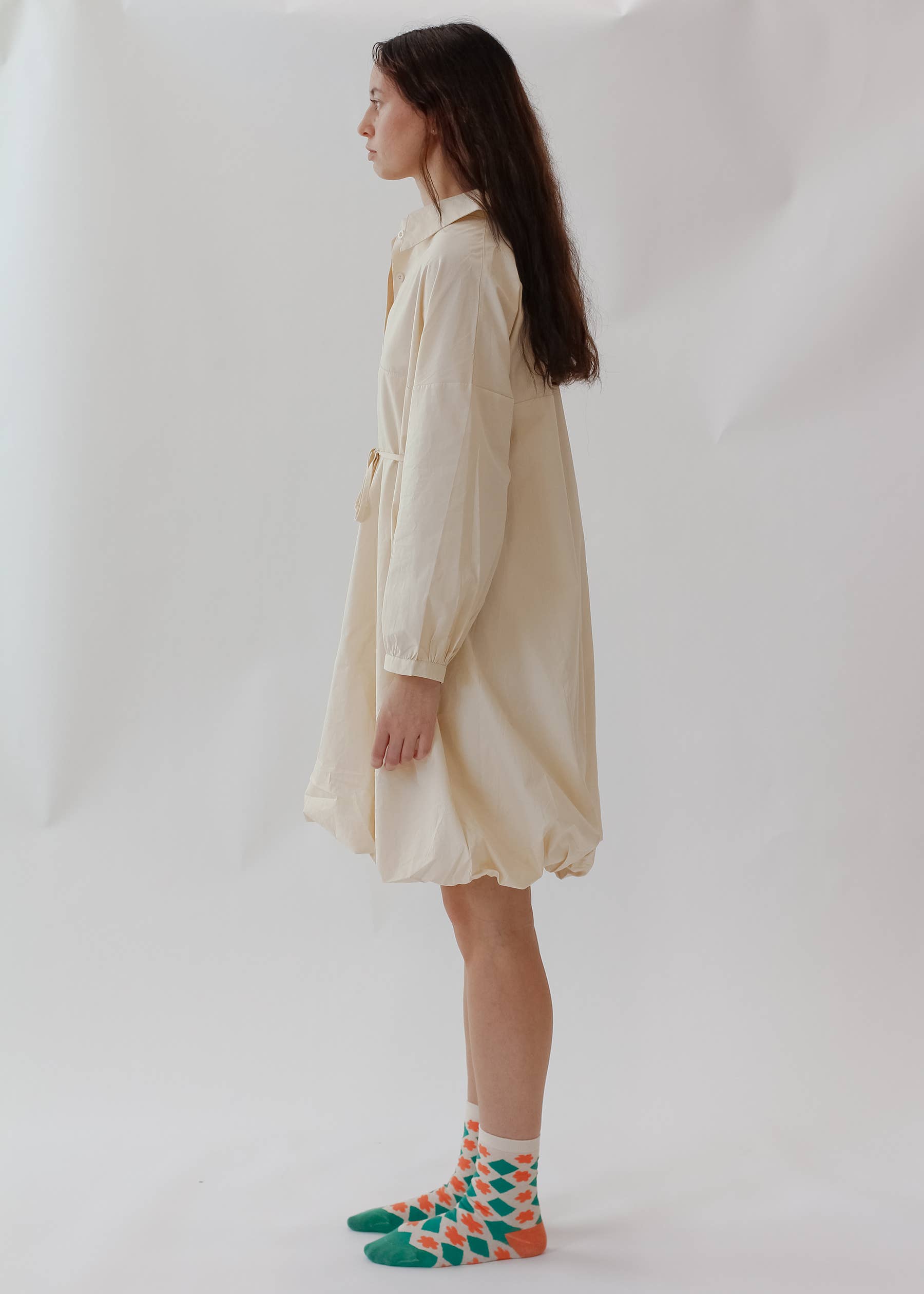 An elasticated, mushroom shaped hemmed dress, with waist ties and an oversized drop shoulder.