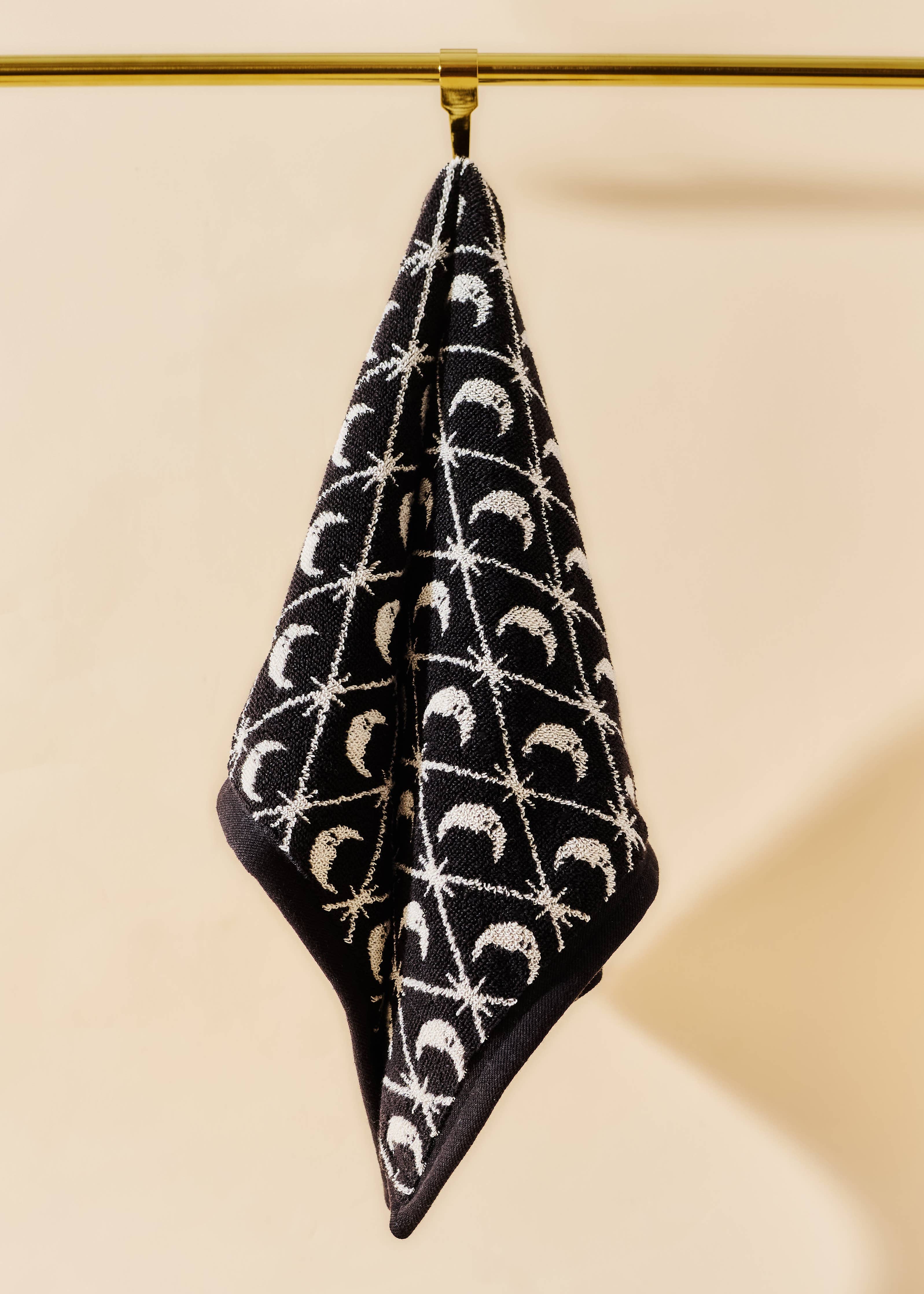 If a celestial autumn is your thing, this soft and absorbent hand towel is perfect for your home! Details: 100% cotton terry cloth Made in the USA Measures 16" x 24" Machine washable Use as hand towel or kitchen towel