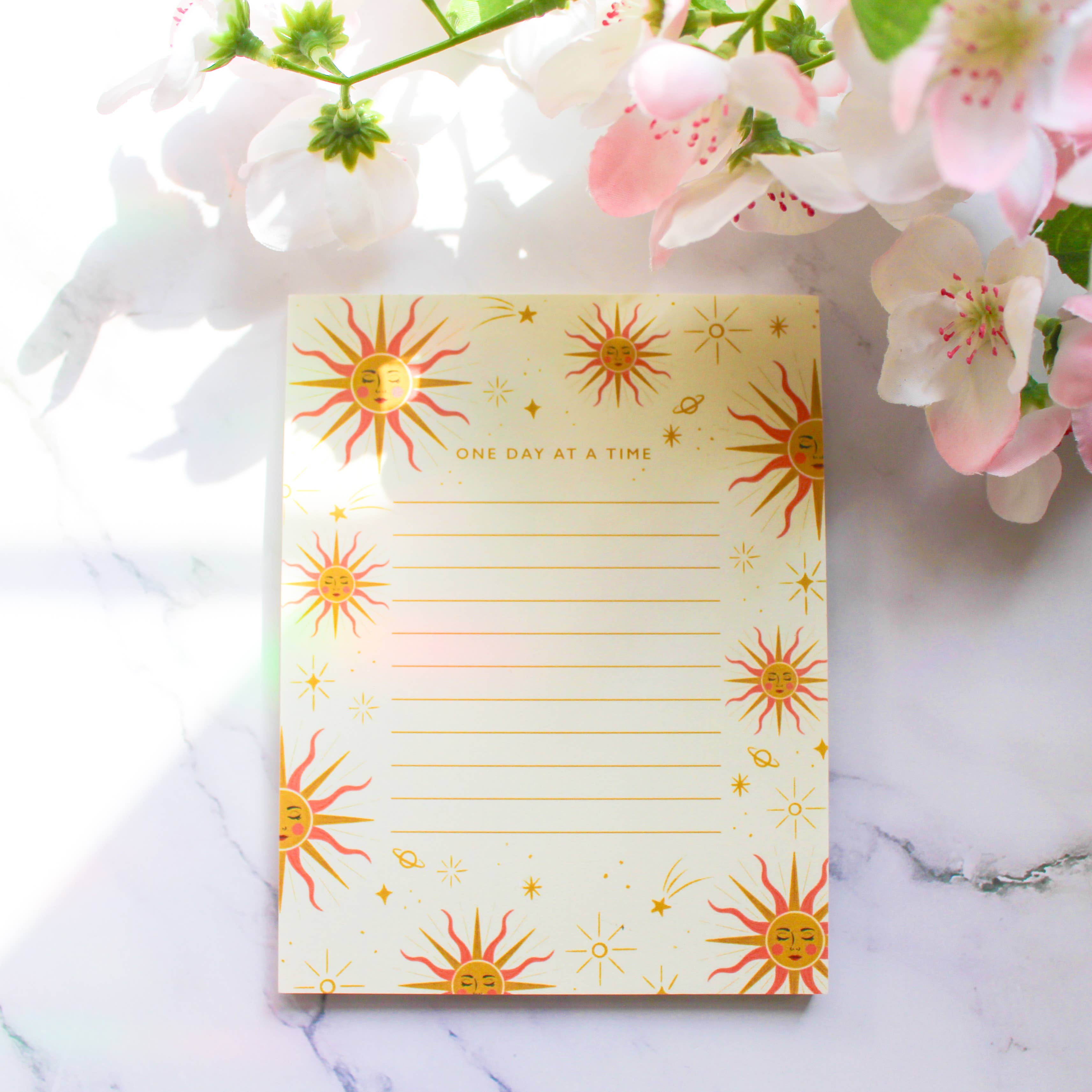 Adorned with a celestial sun pattern and the comforting reminder, "One day at a time," this notepad invites you to embrace each moment with patience, presence, and gratitude.