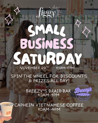 Join us for Small Business Saturday! Support small & local business this holiday season! Stop by anytime 10-6pm spin the wheel for discounts & prizes and enjoy Breezy's Braid Bar & Caphein Coffee!
