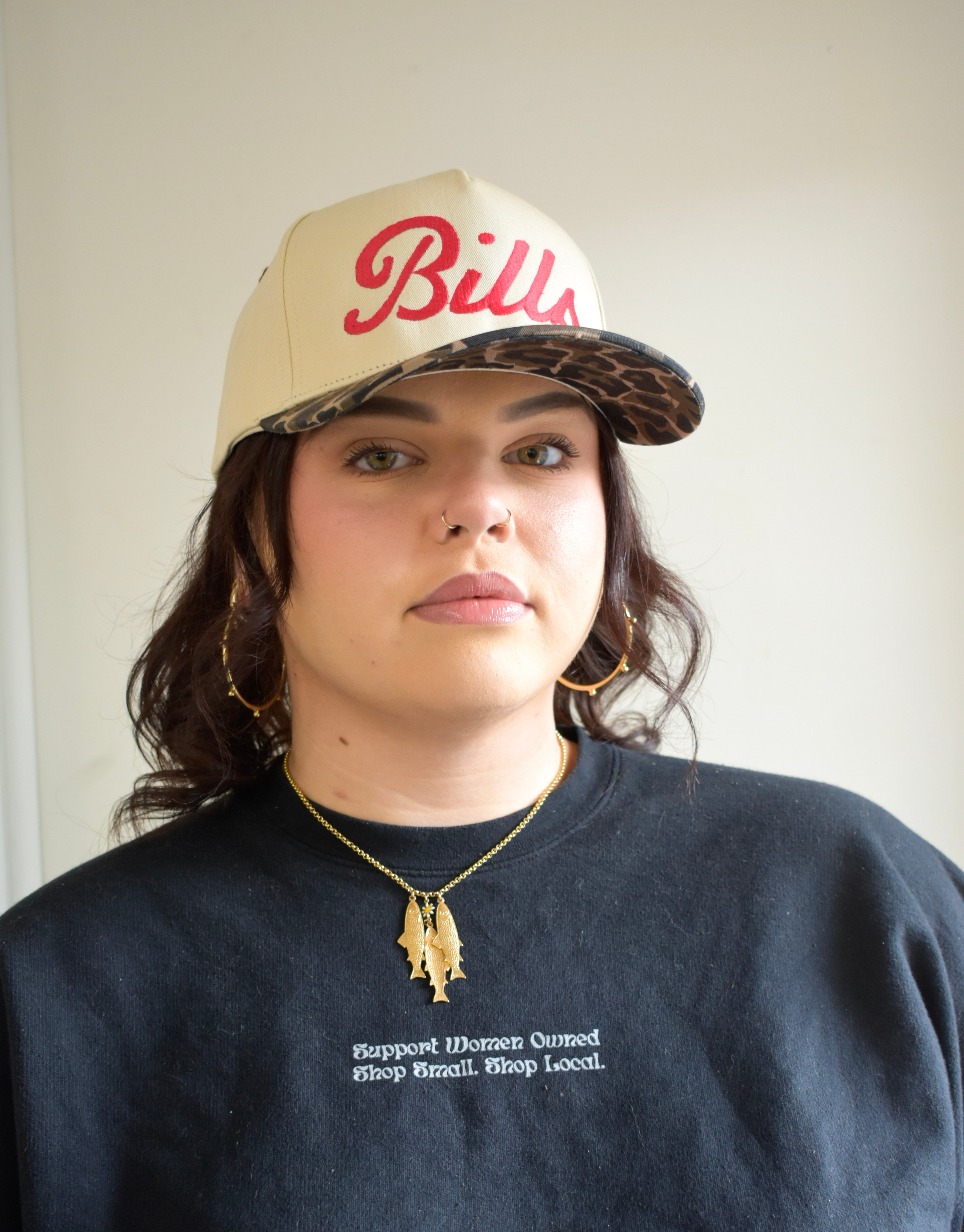 Two Tone Leopard Printed Canvas Trucker Hat with "Bills" Embroidery in Red