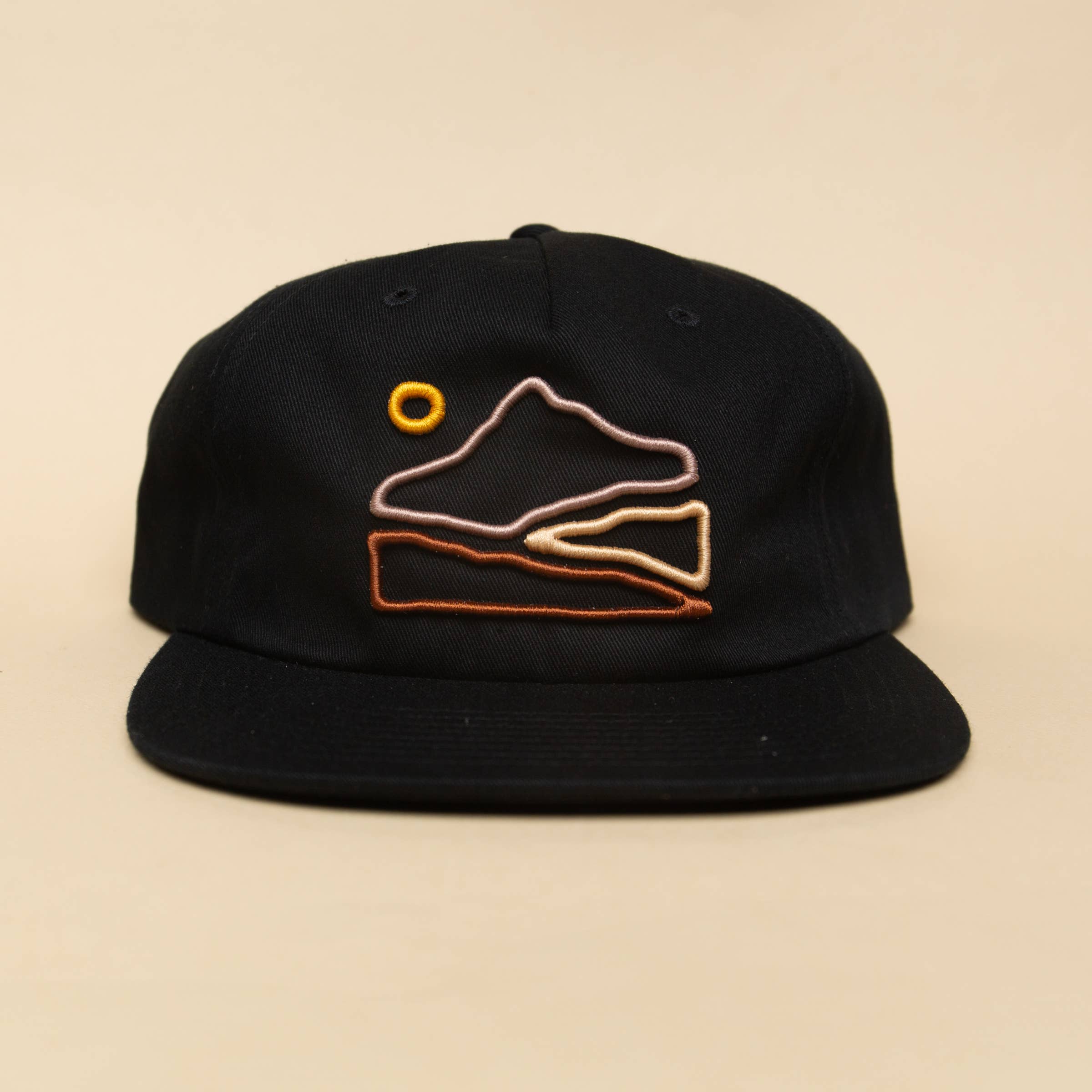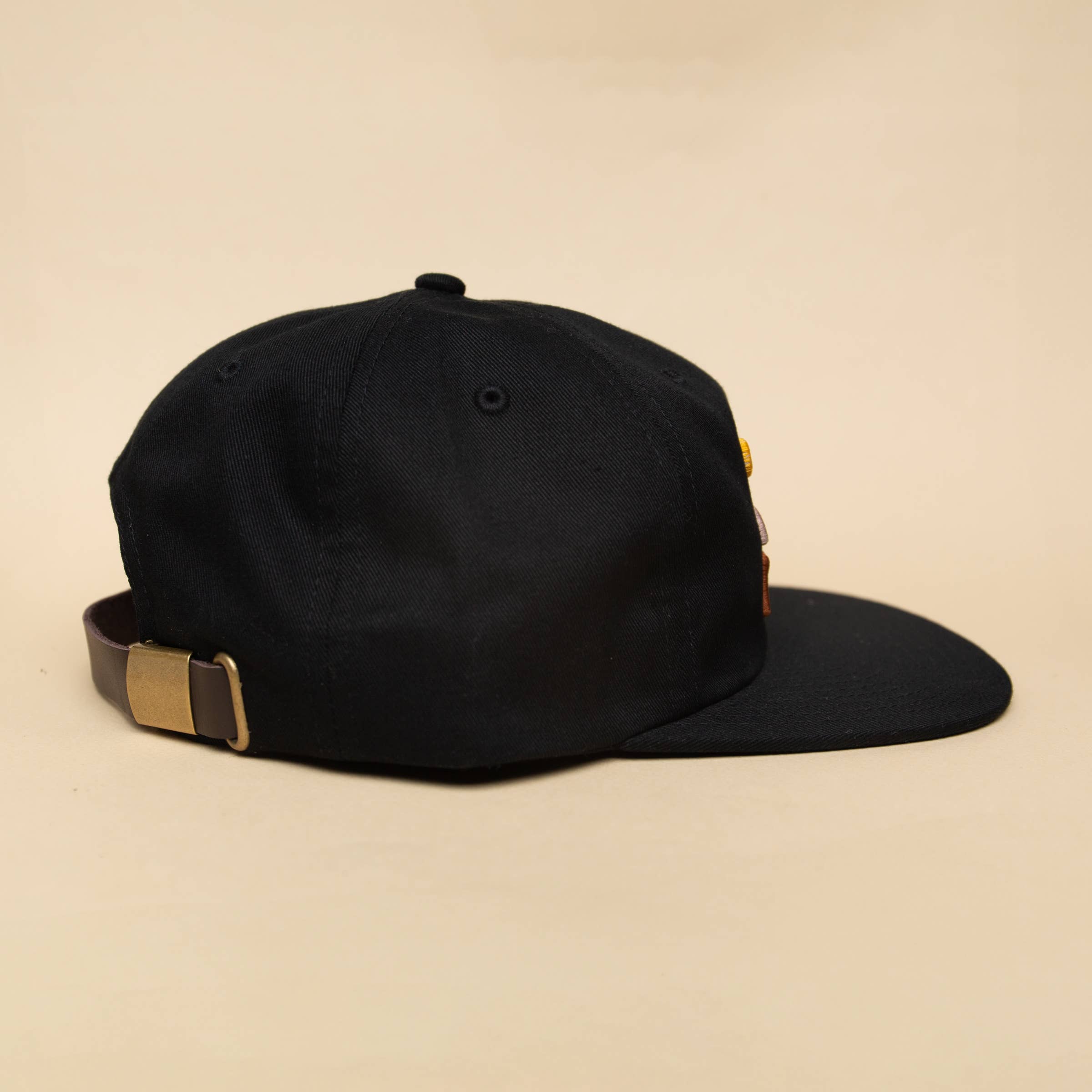 A premium cotton, unstructured, pinch front 5 panel, flat bill, with a premium leather strap with brass clasp. Designed and decorated in Oregon with 3D embroidery. Designed in Portland, Oregon.